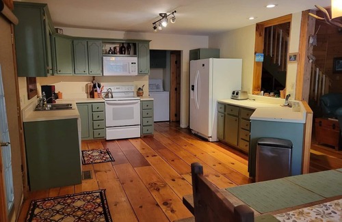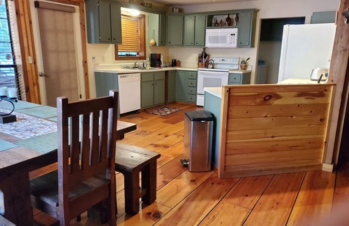 The lodge features an array of modern amenities designed to enhance your stay. With freshly updated cabinets in the kitchen, a spacious open floor plan, and vaulted ceilings, you will feel right at home. Enjoy gatherings in the inviting living area furnished with comfortable couches, including a pull-out bed for extra accommodations. Your guests will love the newly added queen futon on the screened-in porch, which boasts stunning creekfront views, perfect for cozy evenings and beautiful moments together. Outside, you can relax in rockers while taking in the sounds of the bubbling creek or explore the three private acres that promise plenty of space to roam.