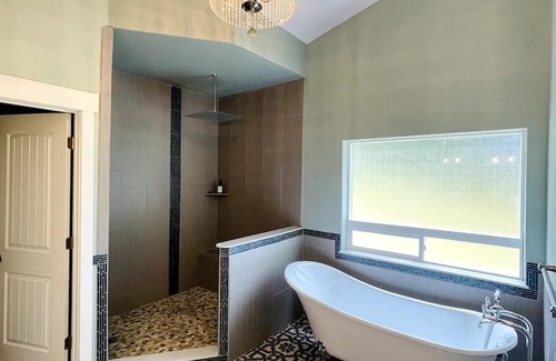 Additionally on the main floor is our king bed master suite with a brand new walk in tile shower and large soaking tub, a full bathroom in the hallway, a bunk bedroom and full size washer and dryer.
