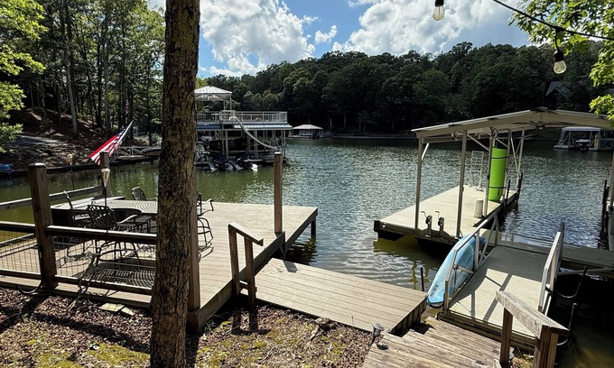 This home is made for fun and relaxation on our secluded cove of Wedowee lake. Large main living room, screened-in porch and large dining room table are wonderful with great lake views! Four bedrooms and four bathrooms are spread across 3 floors. Two primary bedrooms with king beds and bathrooms are on the main level. Lower level has a second living room, ping pong table, TV, full size refrigerator, and walk out to the fire pit. Downstairs bedroom has a queen bed, T/T bunk bed and full bath. The upstairs loft has queen bed, full bath, and a sleeping cot. Two docks provide for max fun in the summertime! Room to dock your boat. Bring your well-behaved pet!