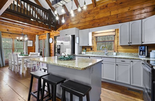 Updated three story cabin with 3 bedrooms that comfortably sleeps up to 8. Family friendly space. Located on a private four acre lake that’s perfect to play in and around. Large outdoor fire pit lounge with string lights. A fully stocked kitchen including coffee supplies, comfortable living room, screened-in porch, gas grill, air conditioning, Wi-Fi, Smart televisions, ample parking, gas-burning fireplace (seasonal), washer/dryer, iron, hair dryers, extra towels and much more!
