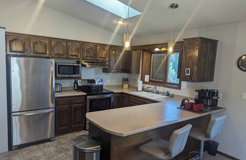 Inside, you’ll find all the amenities needed for a seamless stay. Prepare meals in the fully equipped kitchen, complete with modern appliances and cookware. Jumpstart your mornings at the gourmet coffee bar and stay connected with high-speed Wi-Fi and a dedicated workstation—ideal for remote work or catching up on emails. With three smart TVs throughout the home, entertainment is always at your fingertips. You’ll also enjoy the added convenience of a private one-car attached garage for secure and easy parking.