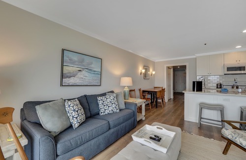 Suite 214 is a second-floor suite with breathtaking views of beautiful Lake Charlevoix. This unit offers one bedroom with a king-size bed and one bathroom with a tub/shower combination. Small soaps are provided. Suite 214 has a kitchenette equipped with dishes and utensils ready for in-suite meals, dining table, and living room featuring a queen size sofa sleeper, gas-log fireplace, and flat-screen TV. The sliding glass door opens to a private balcony that overlooks our private beach.
