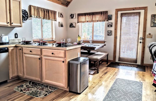 This 4 bedroom/3 bathroom cabin sleeps up to 8, has an open concept floor plan, which is highlighted by the vaulted beetle kill ceilings, with window views of the mature trees that surround the cabin. The living room area has comfortable sofa to watch the smart TV (log into your accounts) or watch movies on the Blu-ray/DVD player. There are lots of movies to choose from or just relax, while enjoying the gas fireplace and the views. There is island seating with 2 bar stools and a high chair is available. The kitchen has all the essentials for preparing a meal and features stainless steel appliances, gas range, dishwasher, microwave, toaster oven, spices and coffee pot. Thru a small hallway off the kitchen, is a full bathroom with a tub/shower, a bedroom with a queen bed and a another bedroom with separate full over full and a twin over full bunk beds. The kid friendly bunk room has lots books and games for their enjoyment.