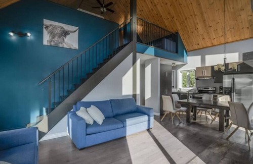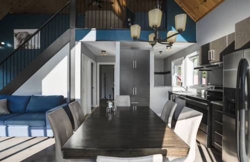 On the ground floor you will find an open area with cathedral ceiling on the kitchen, the living room and the dining room. The central fireplace provides a warm and relaxing atmosphere. The kitchen is fully equipped with fridge, stove, dishwasher, microwave and other kitchen accessories. The dining room can accommodate 10 people at the main table. The living room is equipped with a love seat and a Queen sofa bed while the master bedroom offers a Queen bed. The bathroom is equipped with a washing machine, a dryer and a bath-shower.