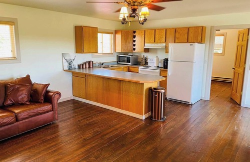 Inside, the cottage welcomes you with hand-scraped hardwood floors, leather furniture, and an open-concept living space. The fully stocked kitchen, complete with high-top bar seating, is perfect for both short stays and longer getaways. Whether you're catching the sunrise with a quiet cup of morning coffee, cooking dinner after a day of fishing or gathering and winding down on the deck with your favorite adult beverage while soaking in the stillness and starry skies of Montana, you’ll feel right at home.
