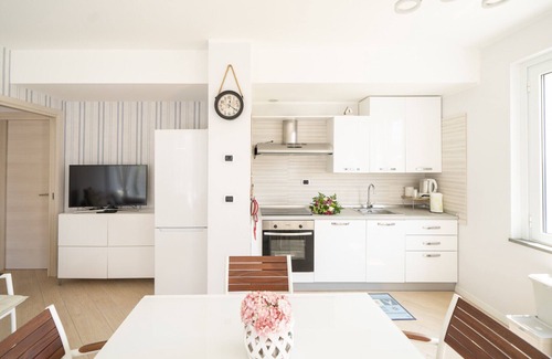 Spacious and bright, the open space integrates linear kitchen with full-size refrigerator, induction hob and dishwasher; glass table for six; sofa that can be converted into four single beds. Large windows with blinds and a smart TV cabinet complete the ambience.