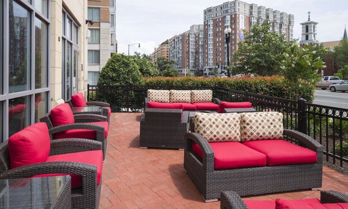 As you glide through our halls, the comforting hum of our welcoming lobby beckons. In your plush room, sunlight dances across soft linens, inviting rest. Morning ushers in with a hearty, complimentary breakfast; evenings are toasted at our vibrant on-site bar. Fitness aficionados revel in our gym's modern touch, while pets find their own cozy corner. Here, every detail weaves together to create an unforgettable tapestry of D.C. hospitality.
