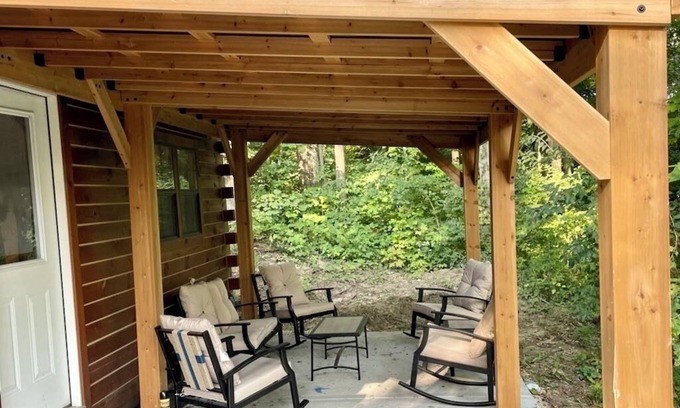 As you walk outside, you will see a picturesque view of timber and nature, which changes every season. There is a covered porch with patio furniture and rocking chairs. If you would like to host a small gathering, there is picnic table that is located behind the cabin near the retaining wall with bench seats and string lights.