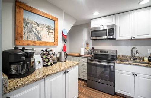 Small appliances include a Keurig coffee maker (with pods provided), toaster, and blender.