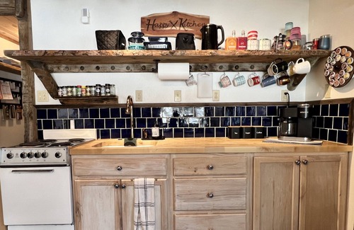 The kitchen is tiny, but mighty. It is very doable for a family of 4, but I would not recommend cooking a large holiday meal. There is a refrigerator/freezer, small oven/stove, sink, microwave, Keurig, french press, kettle, toaster, handheld mixer, pots/pans, food storage containers, cutting boards, utensils, plates, bowls, cups, casserole dishes. There is no dishwasher, but a drying mat, dish soap, and a sponge are provided under the sink. We offer k-cups, ground coffee, tea, sugar, creamer, and a few staple items like spices, oil/vinegar, flour, snacks, etc.