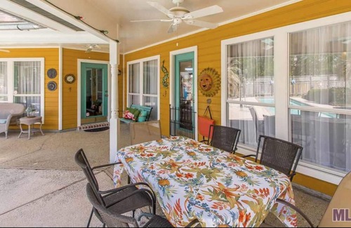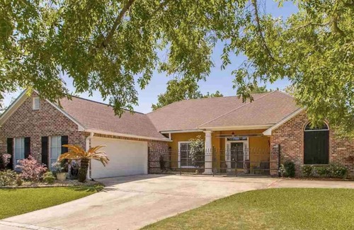 This house sits on a large, private, shaded lot in a quiet upscale community. It is close to shops, library, stores, hospital, movie theater, and parks. Newly remodeled and sparkling clean. Great for families. The backyard is an oasis to relax in with a 50 ft lap pool, shaded patio, outdoor shower, palm trees, swing set, and crab-shack style covered cook area with grill, smoker, sink and fridge and concrete countertops. Inside, there are several living areas to relax in, state of the art audio and video set up. Large kitchen with marble island, countertops, and bar seating. Jacuzzi spa in master bath. Bedrooms are spacious and comfortable with King (master), Queen (bedroom 2), Bunk Beds (bedroom 3). Room in rear of house has a pull out couch. 20 min ride to LSU.