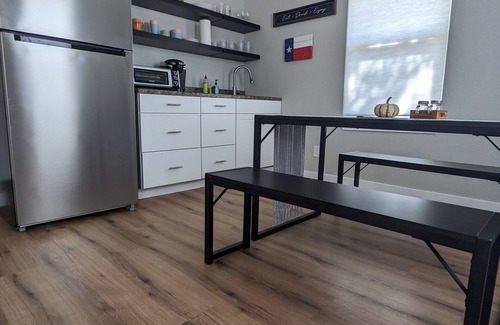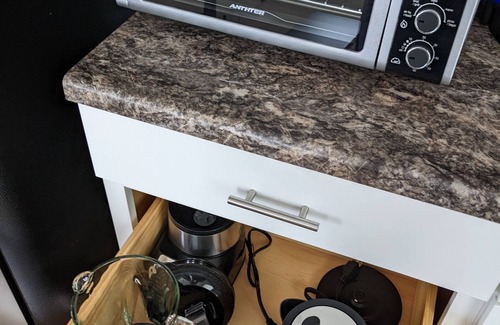- Fully Equipped Kitchenette: The kitchenette features modern amenities including a full-size fridge, portable induction cooktop, toaster-oven/air-fryer, and blender, making it convenient for guests to prepare meals and snacks during their stay.