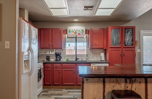 Nestled in the foothills of Yuma AZ, this 3 bedroom 2 Bathroom boasts a large yard with a sparkling pool (not heated, so pretty cold in the winter months) . Enjoy the mild winter days and beautiful winter nights on the large covered patio, complete with large BBQ gas grill, outdoor dining table, and lovely seating area, or come during our spring and summer and enjoy the refreshing pool, and cool A/C to escape the AZ heat . There is a large yard for your full enjoyment complete with new turf area for lounging. The great-room has a custom island with seating, a small dining table, and a fully stocked kitchen. A leather couch and recliner for your T.V. watching comfort.