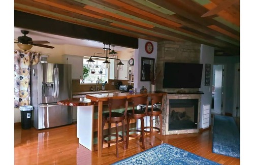 My family and I spent the first year of ownership expanding the kitchen, adding the fireplace, repainting, and redoing the ceiling and walls. The upstairs ceiling has beautiful uniquely stained wood panels.