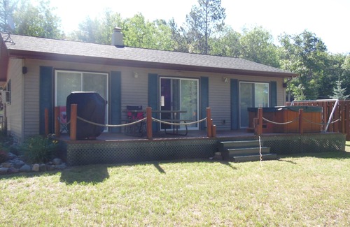 Gorgeous PRIVATE waterfront setting on Beaver Lake. Wonderfully maintained, clean, up-north cottage with 2 bdrms, sleeper sofa, 1 1/2 baths, washer and dryer, large deck, propane grill, outdoor hot tub and fire-pit. The detached garage provides a heated bunk room that can sleep 2. Also included is a paddle boat and all fishing equipment needed. Very close to the swimming and boating lakes Avalon, Long Lake and Ess Lake, ORV and snowmobile trails. Adjacent to thousands of acres of state land for hunting and hiking.