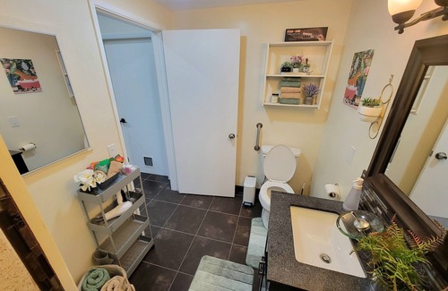 The second bedroom has Queen size bed The living room has a foldout sofa sleeper that sleeps 1 more. We have everything you and a family will need including toiletries, board games, toys, and books.