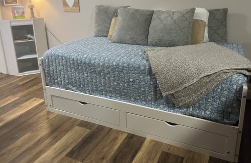 The bedroom has a queen bed with a dresser and closet space for you to unpack and settle in. The living room also contains a sturdy trundle bed with two twin mattresses, and air mattresses are available upon request for additional sleepers.