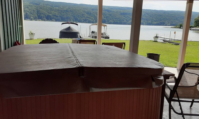 Pack your bags as our home is waiting for you! Walk out lower level family room with patio, grill and griddle. Main floor living space with full balcony overlooking the lake with NO obstructions! Sits beside a marina where you can rent a boat during the warmer seasons for the day to go fishing or to the beach area and jump off the boat or fish off the dock! Bring your own boat! But you can always just relax in a very large hot tub! Roast marshmallows over the open fire pit and make smores. You can also grill on a grate over the pit to enjoy wood cooked food! In the warmer seasons you can play lawn games or choose many in house games. Famous town of Skaneateles just 12 miles away to enjoy in any season!! And visit the wine trails, or take in the theater at the Cortland Repertory Theater and enjoy its relaxing atmosphere! Drive up to hike the nearby 90 foot tall Carpenter's waterfall near Skaneateles or Tinker Falls in Tully NY. Exploring the Village of Skaneateles' unique shops, boutiques and world class restaurants is exciting and memorable! Exploring the wine country on Rt.5/20, and the Finger Lakes Region of beautiful Upstate New York. Also very near are a number of apple orchards, Song Mountain Ski Resort and Greek Mountain and several golf courses. Or you might want to pack a picnic lunch and watch the Polo Games in August on the outskirts of Skaneateles. Join others to turn the turf after each game! Very exciting to watch and participate. Oh yes, try your hand at Kayaking. We have 4 available for your use as well as life jackets! So much to do! Check in at 4:00 pm and begin developing new memories! Check out by 11:00 am hoping to return soon! We look forward to your stay!! Your HOME away from home!