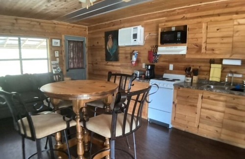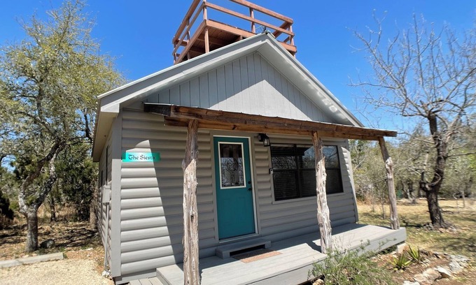 Approaching The Siesta Cabin, nestled among live oak trees, you’ll immediately feel the peaceful charm of a Hill Country escape. The fresh air and soft sounds of nature greet you, while nearby chickens cluck happily, adding to the cabin’s rustic appeal. However, the rooftop deck is calling. Climbing the stairs, you’re rewarded with breathtaking 360-degree views of the Texas sky, perfect for stargazing or watching meteor showers. Sipping fresh roasted coffee at sunrise here will feel like pure bliss. Inside, the cozy 400 sq ft cabin features a private bath, fully equipped kitchen, and a memory foam Queen bed and Queen sofa sleeper. You’ll smile when you open the fridge and see the colorful farm-fresh eggs tucked inside a ceramic Mexican chicken, ready to inspire breakfast. Even your pet is welcome, with treats waiting to make their stay special too!