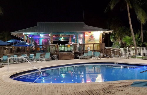 Tiki bar/restaurant offering live music and a marina are on the property. Gas grills are available. The fully equipped kitchenette includes oven, microwave, full size refrigerator and dishwasher.
