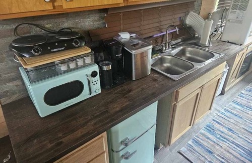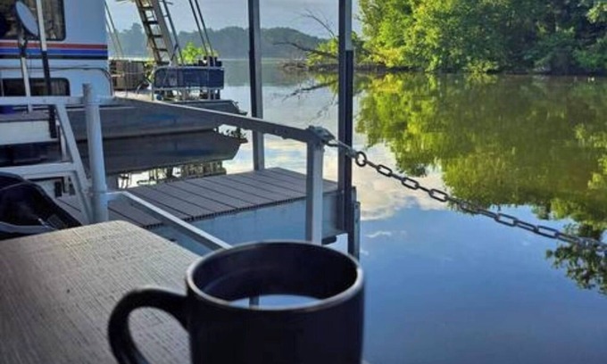 And if you're craving the excitement of the city, a quick 20-minute drive will take you to Nashville, where endless entertainment and cultural experiences await. With so much to see and do, along with the unique charm of your own private houseboat, this is a vacation you won't soon forget. Book your stay now and create unforgettable memories in this picturesque setting! Rustic cabin style small houseboat with cozy space for 2 with tons of charm! Wake up to the sounds of the water and go to bed watching an amazing sunset! Perfect for a lovers retreat, girls weekend, or even guys fishing trip! Many cozy features such as: full size lower deck bed with private TV, Music, and river view. Very small bathroom and kitchenette. Upper deck twin bed with outside view. Kayaks provided anchored on port side that are free to use along with fishing poles for the avid outdoor lovers. Stern patio furniture for early morning wildlife watching. This is a small houseboat docked at a marina on a lake.