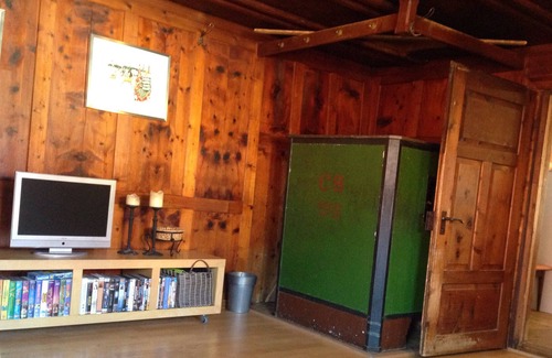 Living room with sofa, corner seat, TV (no TV connection), DVD, video, books, folders with hiking suggestions.