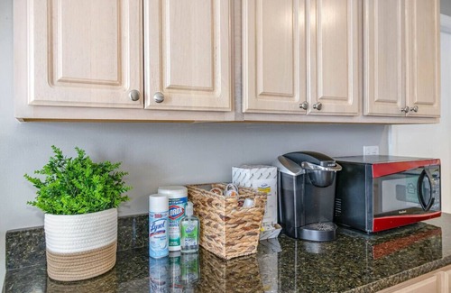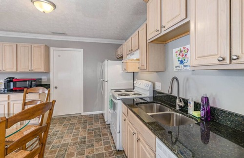 This kitchen has everything you need for your stay, including a Keurig coffee maker (with plenty of coffee), microwave, dishwasher and stovetop oven. The kitchen table seats six people comfortably. Since this is open to the living room, you can also enjoy the TV while sitting at the table.