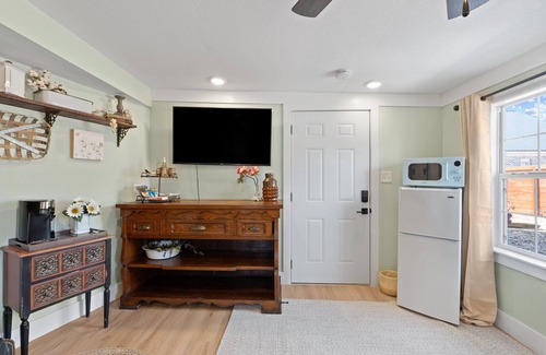 Enjoy the convenience of an apartment-sized refrigerator with a freezer full of Sonic ice, perfect for refreshing drinks. You'll also find a pitcher of fresh fruit-infused water and lemonade.