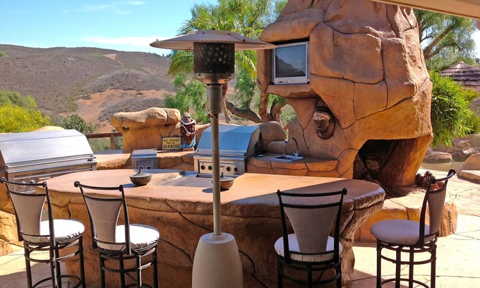 Located 45 minutes from LA, relax at this private tropically themed get away. Amenities include a spacious living area, kitchen, steam room, sauna, salt water pool and hot tub, outdoor shower and bath, home theatre with rumble seats, juke box, dance floor, pinball machine, vegas style poker machines, tiki hut with bar, outdoor barbecue and cooking area, and even a pen with 3 beautiful emus! You can't ask for a more perfect location for your next staycation!