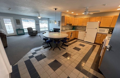 This level you will have direct access from the driveway and enter into the kitchen area. Fully stocked kitchen to prepare home made meals with plenty of storage and counter space, microwave, toaster, Keurig , teapot and all other essentials available. Large unique round kitchen table with seating for 10, which then opens up into the wide open living space. To the left of the room is couch with seating for 6 and a recliner to view the 86” flatscreen tv ( equipped with Roku access) and a beautiful view of the lake with large lake front windows. To the right additional seating/bedding with a futon and recliner .this level has direct access to the upper deck with out door seating and table to enjoy meals outside and BBQ grill . Full bathroom on this level with tub/shower combo