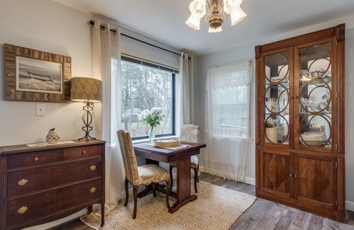 Quiet lakefront retreat in gated community on Lake Palestine with beautiful views inside and out. This charming two story lakefront is located 15 minutes southwest of the historic Tyler, Texas. It offers a boat dock great for fishing, beach for swimming, fire pit, BBQ, hammock, cable tv with a sports package, double-car drive-thru carport and a marina just 2min down the road. If you are looking for a relaxing retreat in a tranquil environment this is the place for you. The home is beautifully decorated and has everything you need for a relaxing stay. The three bedrooms have high-end memory foam and pillow-top queen mattresses, with soft linens that will make it hard to get out of bed in the morning. The back porch has two levels with a beautiful views of the large tree-lined backyard and the gorgeous lake.