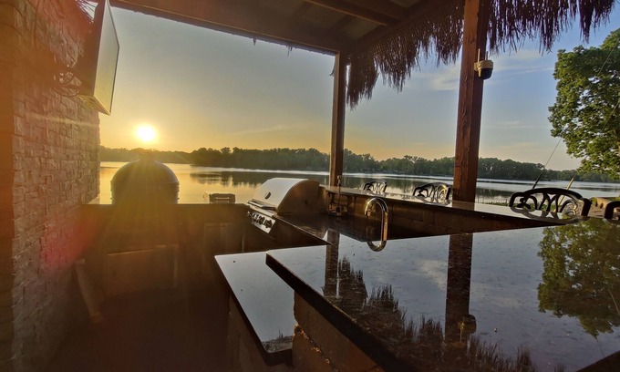 Venture out to this secluded waterfront resort in nature, surrounded by the lake! Watch the sunset over the water while you enjoy the outdoor area that includes a sprawling granite kitchen and high-top bar complete with propane grill, hot stove eye, a Big Green Egg, and bring your marshmallows for the propane fire pit. Fish from the beautiful brick pier into the floating lily pads that surround the peninsula.