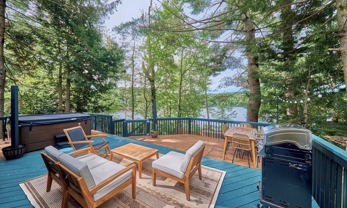 Surrounded by trees, and with a stunning lake view, this 1940 cottage will have you in relaxation mode in no time. Explore the area, or simply hang out and enjoy the view, hot tub, fire pit, kitchen with new appliances, and indoor fireplace. Nearby, there are lakes, scenic drives, Bethel Woods, and the towns of Narrowsburg, Livingston Manor, and Roscoe. Dogs allowed with approval, and the property is fully fenced. There are other houses nearby, but still private. Note that while my home has a lovely view of the lake, due to HOA rules, short-term renters are not allowed to use the lake.