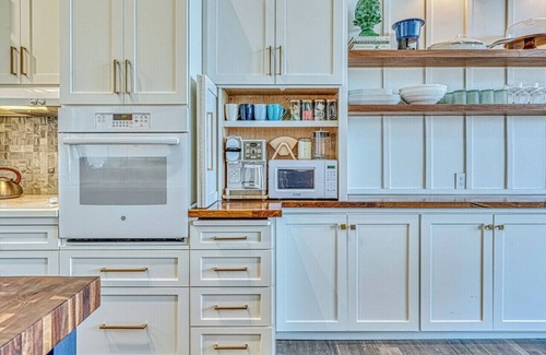 - Refrigerator, 4 burner electric stove stop, single electric wall oven, dishwasher, microwave, double sink, filtered drinking water, garbage disposal, solid surface quartz counter-tops, toaster, waffle maker, crock pot, rice maker, fondue pot, coffee maker & Keurig
