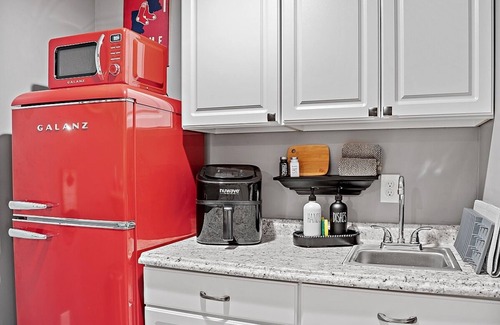 Kitchenette has full size refrigerator with freezer, small sink, microwave, coffee maker, electric tea kettle, toaster, air fryer.