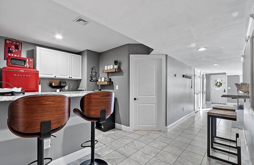 This space features two bedrooms each with a queen bed. Additionally, outside one of the bedrooms there is a nook with Murphy Bed for bookings OVER 4 or by request. One full bath with large shower stall, well equipped Kitchenette, cozy living room with Smart 75" TV, and a gym with a treadmill, multifunction weight rack, 55" TV with Amazon Fire stick, and workout mirrors.