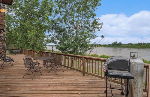 Secluded cabin located on the Missouri River across from downtown Omaha & Eppley Airfield. <15 Minutes to the Old Market, CHI Center, TD Ameritrade Park (College World Series), Henry Doorly Zoo. 3 main floor bedrooms & loft suite. Sleeps 10+ (1 King, 2 Queens, Trundle Bed, Sofa Hide-a-bed) 20+ft ceilings w/ wood fireplace, 65" Smart TV. Large wrap around deck overlooking the river, Firepit, Private boat ramp, Plenty of Parking (no garage access). Great for Staycations, Group Gatherings or R&R!