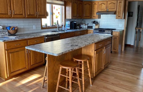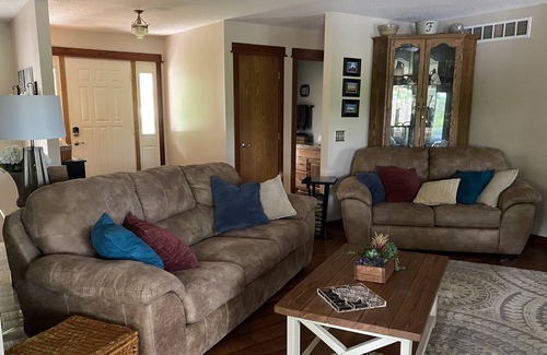 Lovely 4 bedroom, 3 bath home nestled in a cozy secluded neighborhood along the Cedar River. Recently updated to make your stay very comfortable. Beautiful river view with the most amazing sunsets from the large deck or many windows. Large kitchen, two gathering areas, huge master bedroom with amazing new master bath. Additional bedroom up, and two down. Lower level gathering room with wet bar and gym. Close to nature trail, historic railroad bridge, golf course and much more.