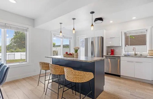 Our beautiful river home has a fully equipped kitchen with everything you may need to cook from home and a new Keurig coffee maker. (We provide the coffee tabs.) Although this home is on a secluded road, it has fast enough wifi for the kids to stay connected and for adults to get some extra work done if need be. There are two smart TVs with ROKU (bring your own logins) and a top-of-the-line Sonos speaker. There are two full bathrooms that each include a shower. The upstairs bathroom does not have a door. Instead, we have a blackout curtain to provide ample privacy. This home has three bedrooms: one with a queen bed, one with a king bed and a pull-out day bed, and one with a full bed. The second bedroom upstairs is a walk-through bedroom through the master, with no door. Our couch on the first floor doubles as a sleeper sofa and pulls out to a queen bed. Enjoy unmatched views of the Rock River in front of a peaceful no-wake zone from our brand-new comfortable outdoor furniture. We also have a new grill and firepit that guests can access. We provide propane, but guests will be in charge of bringing their own firewood. Every piece of furniture in this home is brand new as of September 2023.
