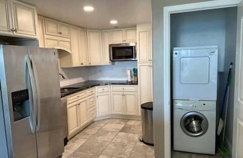 There is a Queen size sofa bed in the Living Room. This is a downstairs unit. There is a lighted concrete pathway to the entrance.