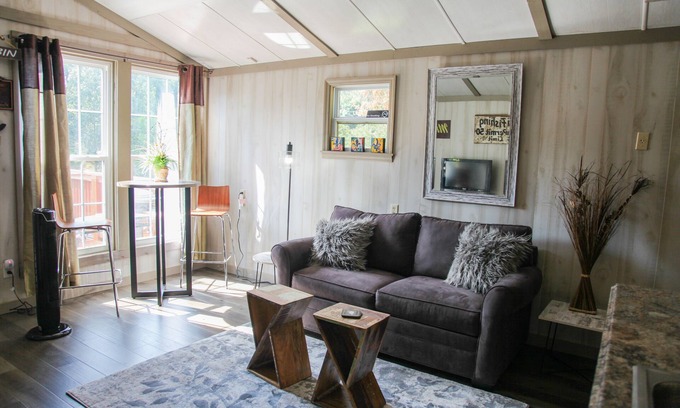 Our Ragin' Cajun Cabin is the perfect spot for a relaxing, outdoorsy stay! Whether you like glamping or tiny homes or fishing or romancing or just "hangin' out", this is going to be your favorite place. This cozy cabin is a one-bedroom, one-bathroom, den with sleeper sofa, climate-controlled home. You can get away from it all here! There are three levels of decking down to the water, where you can swim or fish or lay in the sun. The back deck has a charcoal grill; the front yard has a fire pit with wood supplied. A fast-moving creek is near and you can hike all of our 35 acres. You will see lots of wildlife to add to your adventure.