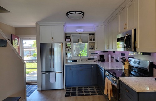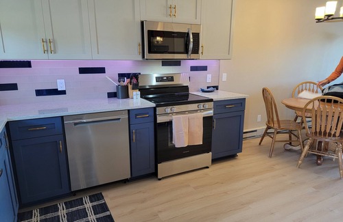 Two bedrooms, 1.5 bathrooms, full kitchen, washer and dryer, gas fireplace. Both bedrooms are on the second floor; the stairs up to the second floor are not steep but please be aware of this. Our couch is a full-sized pullout bed.