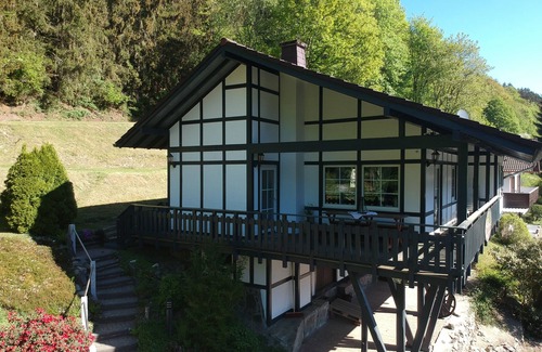 The quietly located wooden house is located in the Eifel valley of Keinwalertal, in the middle of the Eifel National Park, in Erkenruhr.