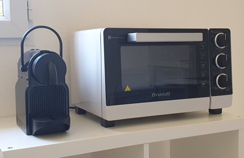In the kitchen there is a stove with two plates, refrigerator, mini oven, coffee machine (Nespresso), toaster and crockery at disposal.