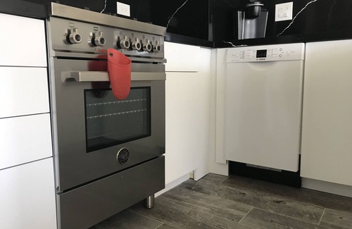 Full kitchen with Bertazzoni gas stove, Bosch refrigerator and dishwasher