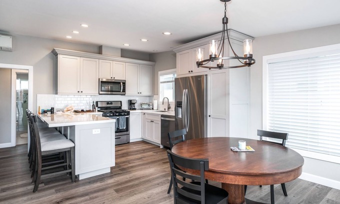 Stepping inside, the kitchen has plenty of counter space for preparing food and extra storage. Bedroom 1 has a comfy queen bed. Bedroom 2 has a bunk bed with a full size mattress on bottom and twin on top. One bathroom is situated between the bedrooms. Shared laundry room with the lower unit guests complete with washer and dryer. You have have full access to park 2 cars in garage.
