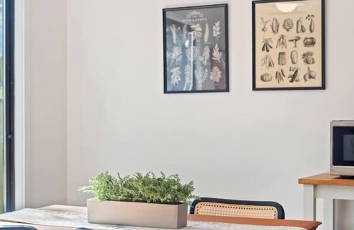 For remote workers, the dedicated workspace includes a desk, chair, and high-speed Wi-Fi. The kitchen is fully equipped with stainless steel appliances and all the essentials for cooking and entertaining. The living room has plenty of space to relax and unwind and features a smart TV and fireplace.