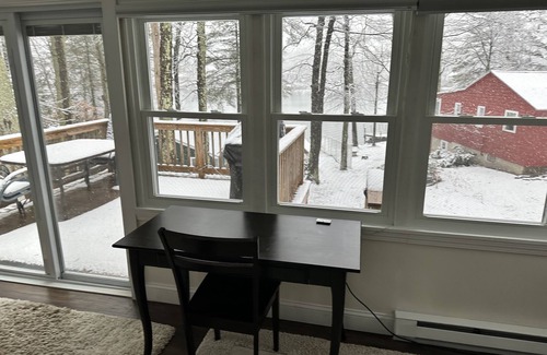 Our cozy, family friendly and completely remodeled lake house enjoys modern conveniences with private lake access and quick access to Boston (only 45 mins!). The vacation getaway is located on Lost Lake in beautiful Groton, MA bordering serene conservation land on 2 sides and facing a small private beach with dock. The location offers a balance of natural beauty with a convenience to amenities allowing you to get away from the fast paced city life but return at your leisure!. Wall to wall windows provide relaxing lake views and the kitchen faces conservation land with a pretty cove teeming with wildlife. Play & relax in the lake, then cook in a modern kitchen or grill on the deck. Guests will have access to the beach (with table and beach chairs), deck (with grill and furniture), fire pit area and we rent a canoe with life vests.