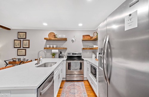Experience historic charm and modern comfort in our two-bedroom vacation home, a true gem dating back to the early 1900's. Nestled on a peaceful, tree-lined street, this beautifully renovated house offers the perfect blend of vintage character and contemporary amenities. Step inside to discover a newly renovated interior, highlighted by a stunning bathroom featuring a spacious walk-in glass shower. The open floor plan seamlessly connects the fully-equipped kitchen and inviting living room, adorned with gorgeous hardwood floors. For those who love the outdoors, the fenced backyard is a tranquil oasis, complete with a lovely deck, making it ideal for relaxation and al fresco dining. And yes, we're small-dog friendly, so your furry friend can enjoy the vacation too! With the capacity to sleep up to 6 guests, our property is perfect for families, groups, or a romantic getaway. A washer and dryer are included for your convenience, ensuring you can pack light. You'll find our location is equally appealing. We're just a short 10-minute walk (or half a mile) from historic downtown, where you can explore charming shops, dine-in delicious restaurants, and soak in the rich history of the area. Even closer, a 5-minute stroll takes you to the beautiful GCSU campus, the Centennial Center, and the historic Governor's Mansion. With a multi-vehicle driveway, your parking needs are well-covered. So why wait? Book your stay at out historic yet contemporary property and create lasting memories in this charming and vibrant community!