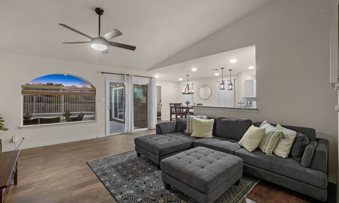 Recently renovated home offers a floor plan that opens up to the inviting backyard! Enjoy the day with your guests around the 4 ft - 6 ft pool. Backyard is equipped with a gate which provides added security from children entering the pool. Plenty of space in the backyard, plenty of room for tanning and relaxation, soaking in the sun! Backyard sits east facing, in the mornings enjoy your favorite morning beverage as you're viewing the sunrise. Landscaping is desert terrain. You'll enjoy the fully equipped updated kitchen ready for all your cooking needs, stocked coffee area. Living area offers a sectional couch and adjacent is the dining area that easily fits 5 - 6 chairs. Bedrooms are adequate size with extra pillows and blankets. Home offers 3 smart TVs, easily connected to Netflix, etc. Tastefully decorated throughout providing a very comfortable setting. Flex room sits near the master bedroom, this room may change its function throughout time. Currently set up as an office. This unique floor plan offers 3 sliding doors, easy and convenient access to the backyard. Another reason you'll love your stay is because you are minutes from everything!